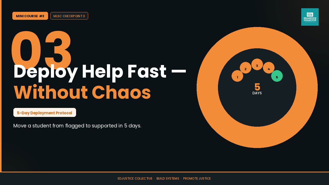 Map the specific bottleneck in your building that delays students from starting support after identification Apply the 5-Day Deployment Protocol to move a student from referral to first intervention session Audit your master schedule for intervention slot conflicts that block timely deployment Write a family contact plan that reaches families on Day 1 in their preferred format and language