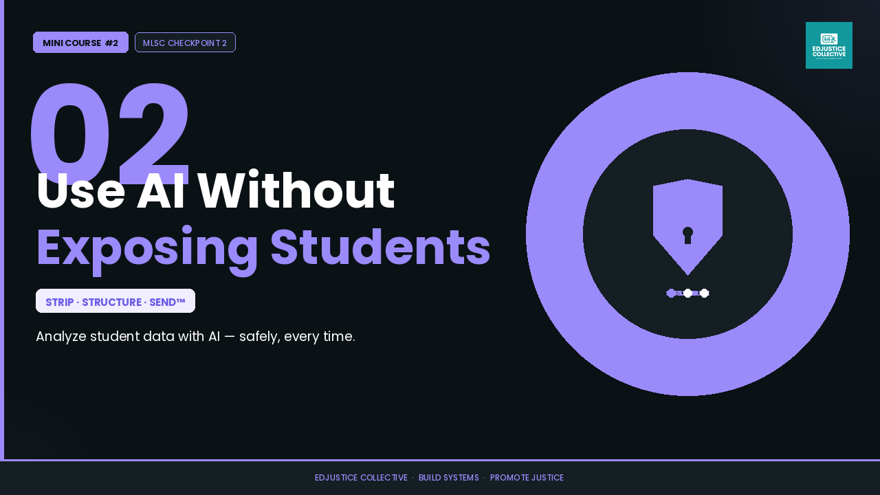 Classify student data into three protection layers: Open, Restricted, and Never Apply the STRIP step to remove all direct and indirect student identifiers before using AI Learn how to responsibly structure AI prompts that produce actionable insights from de-identified data Use the 5-Check Protocol to verify any AI interaction is FERPA-compliant in 30 seconds